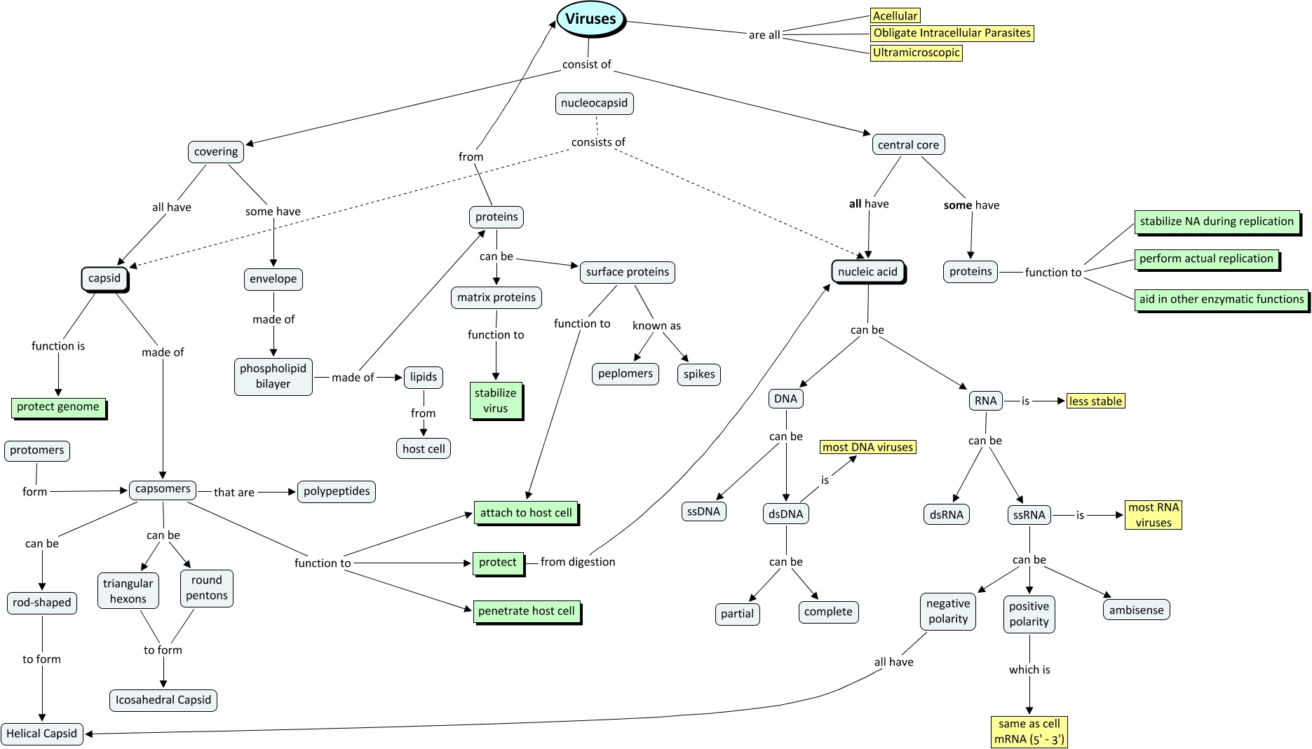 Virus Characteristics, round pentons to form Icosahedral Capsid, ssRNA can be negative polarity, nucleic acid can be DNA, dsDNA is most DNA viruses, matrix proteins function to stabilize virus, capsid made of capsomers, central core some have proteins, capsid function is protect genome, capsomers can be triangular hexons, surface proteins function to attach to host cell