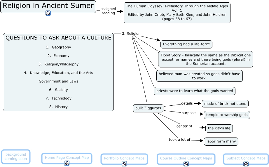 This Concept Map, created with IHMC CmapTools, has information related to: 03 Religion in Ancient Sumer, built Ziggurats details made of brick not stone, built Ziggurats purpose temple to worship gods, built Ziggurats center of the city's life, built Ziggurats took a lot of labor form many, Religion in Ancient Sumer assigned reading The Human Odyssey: Prehistory Through the Middle Ages Vol. 1 Edited by John Cribb, Mary Beth Klee, and John Holdren (pages 58 to 67), QUESTIONS TO ASK ABOUT A CULTURE 1. Geography 2. Economy 3. Religion/Philosophy 4. Knowledge, Education, and the Arts Government and Laws 6. Society 7. Technology 8. History 3. Religion Everything had a life-force, QUESTIONS TO ASK ABOUT A CULTURE 1. Geography 2. Economy 3. Religion/Philosophy 4. Knowledge, Education, and the Arts Government and Laws 6. Society 7. Technology 8. History 3. Religion Flood Story - basically the same as the Biblical one except for names and there being gods (plural) in the Sumerian account., QUESTIONS TO ASK ABOUT A CULTURE 1. Geography 2. Economy 3. Religion/Philosophy 4. Knowledge, Education, and the Arts Government and Laws 6. Society 7. Technology 8. History 3. Religion built Ziggurats, QUESTIONS TO ASK ABOUT A CULTURE 1. Geography 2. Economy 3. Religion/Philosophy 4. Knowledge, Education, and the Arts Government and Laws 6. Society 7. Technology 8. History 3. Religion believed man was created so gods didn't have to work., QUESTIONS TO ASK ABOUT A CULTURE 1. Geography 2. Economy 3. Religion/Philosophy 4. Knowledge, Education, and the Arts Government and Laws 6. Society 7. Technology 8. History 3. Religion priests were to learn what the gods wanted