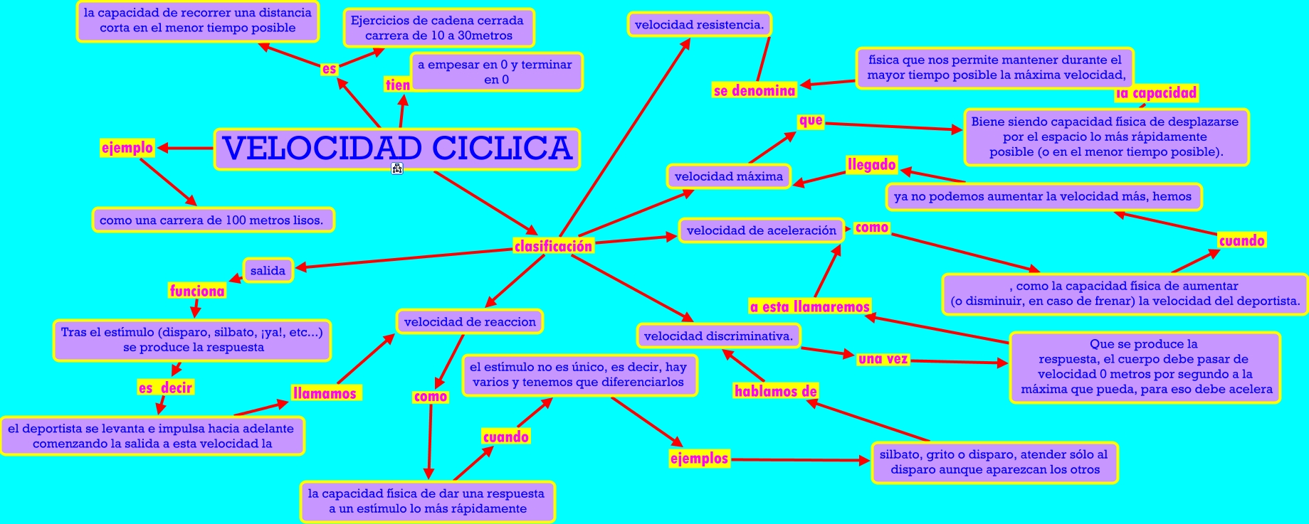 Este Cmap, tiene información relacionada con: velocidad ciclica, VELOCIDAD CICLICA es la capacidad de recorrer una distancia corta en el menor tiempo posible, velocidad de aceleración como , como la capacidad física de aumentar (o disminuir, en caso de frenar) la velocidad del deportista., VELOCIDAD CICLICA es Ejercicios de cadena cerrada carrera de 10 a 30metros, VELOCIDAD CICLICA clasificación velocidad máxima, VELOCIDAD CICLICA tiende a empesar en 0 y terminar en 0, velocidad discriminativa. una vez Que se produce la respuesta, el cuerpo debe pasar de velocidad 0 metros por segundo a la máxima que pueda, para eso debe acelera, VELOCIDAD CICLICA ejemplo como una carrera de 100 metros lisos., la capacidad física de dar una respuesta a un estímulo lo más rápidamente cuando el estímulo no es único, es decir, hay varios y tenemos que diferenciarlos, ya no podemos aumentar la velocidad más, hemos llegado velocidad máxima, , como la capacidad física de aumentar (o disminuir, en caso de frenar) la velocidad del deportista. cuando ya no podemos aumentar la velocidad más, hemos, VELOCIDAD CICLICA clasificación velocidad discriminativa., silbato, grito o disparo, atender sólo al disparo aunque aparezcan los otros hablamos de velocidad discriminativa., el estímulo no es único, es decir, hay varios y tenemos que diferenciarlos ejemplos silbato, grito o disparo, atender sólo al disparo aunque aparezcan los otros, velocidad de reaccion como la capacidad física de dar una respuesta a un estímulo lo más rápidamente, VELOCIDAD CICLICA clasificación velocidad de aceleración, Tras el estímulo (disparo, silbato, ¡ya!, etc...) se produce la respuesta es decir el deportista se levanta e impulsa hacia adelante comenzando la salida a esta velocidad la, salida funciona Tras el estímulo (disparo, silbato, ¡ya!, etc...) se produce la respuesta, VELOCIDAD CICLICA clasificación velocidad de reaccion, Biene siendo capacidad física de desplazarse por el espacio lo más rápidamente posible (o en el menor tiempo posible). la capacidad física que nos permite mantener durante el mayor tiempo posible la máxima velocidad,, el deportista se levanta e impulsa hacia adelante comenzando la salida a esta velocidad la llamamos velocidad de reaccion