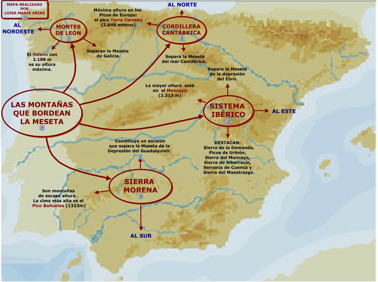 Este Cmap, tiene información relacionada con: MONTAÑAS QUE RODEAN LA MESETA1, SIERRA MORENA Constituye un escalón que separa la Meseta de la Depresión del Guadalquivir., CORDILLERA CANTÁBRICA AL NORTE, SISTEMA IBÉRICO Separa la Meseta de la depresión del Ebro., LAS MONTAÑAS QUE BORDEAN LA MESETA SIERRA MORENA, SISTEMA IBÉRICO DESTACAN: Sierra de la Demanda, Picos de Urbión, Sierra del Moncayo, Sierra de Albarracín, Serranía de Cuenca y Sierra del Maestrazgo., SIERRA MORENA Son montañas de escasa altura . La cima más alta es el Pico Bañuelas (1323m), LAS MONTAÑAS QUE BORDEAN LA MESETA MONTES DE LEÓN, CORDILLERA CANTÁBRICA Separa la Meseta del mar Cantábrico., MONTES DE LEÓN AL NOROESTE, SIERRA MORENA AL SUR, SISTEMA IBÉRICO La mayor altura está en el Moncayo (2.313 m), SISTEMA IBÉRICO AL ESTE, CORDILLERA CANTÁBRICA Máxima altura en los Picos de Europa: el pico Torre Cerredo (2.648 metros), MONTES DE LEÓN Separan la Meseta de Galicia., MONTES DE LEÓN El Teleno con 2.188 m es su altura máxima., LAS MONTAÑAS QUE BORDEAN LA MESETA SISTEMA IBÉRICO, LAS MONTAÑAS QUE BORDEAN LA MESETA CORDILLERA CANTÁBRICA