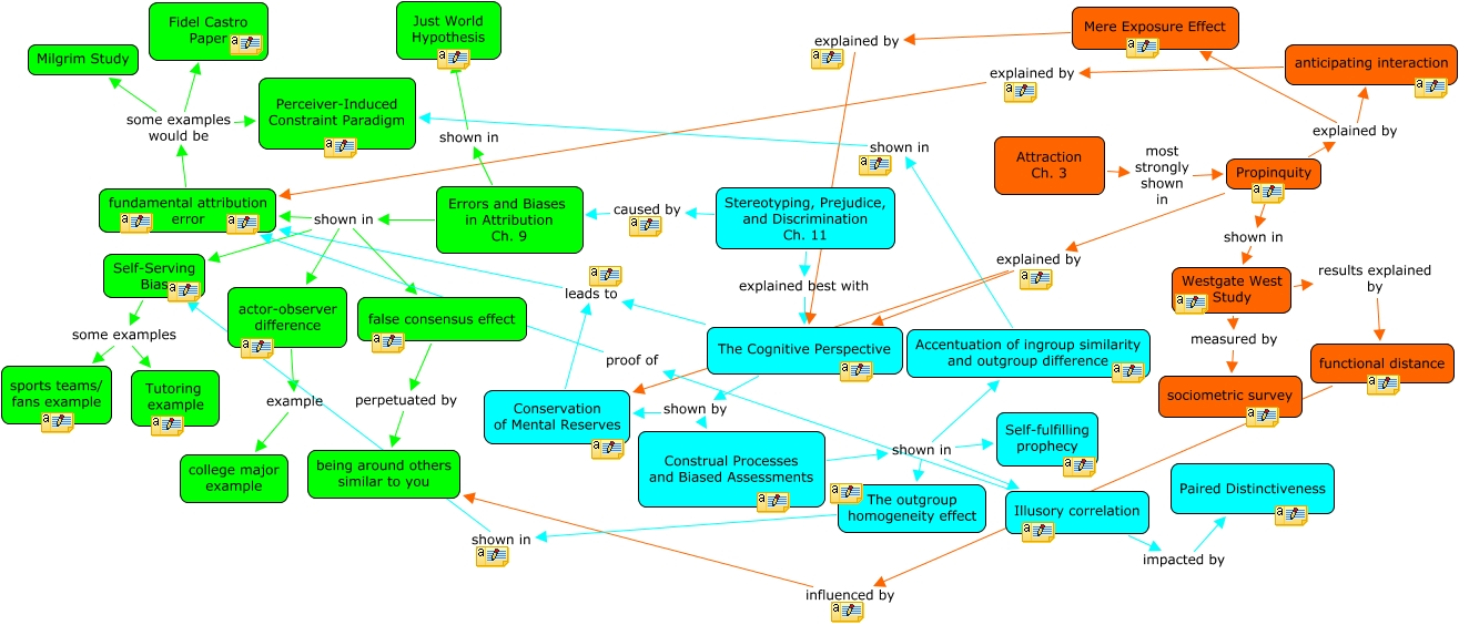 This Concept Map, created with IHMC CmapTools, has information related to: Final CMAP, Construal Processes and Biased Assessments shown in Accentuation of ingroup similarity and outgroup difference, fundamental attribution error some examples would be Perceiver-Induced Constraint Paradigm, The Cognitive Perspective leads to fundamental attribution error, Propinquity shown in Westgate West Study, Propinquity explained by The Cognitive Perspective, Westgate West Study results explained by functional distance, Errors and Biases in Attribution Ch. 9 shown in actor-observer difference, The Cognitive Perspective shown by Construal Processes and Biased Assessments, Self-Serving Bias some examples sports teams/ fans example, Westgate West Study measured by sociometric survey, Mere Exposure Effect explained by The Cognitive Perspective, Construal Processes and Biased Assessments shown in The outgroup homogeneity effect, Accentuation of ingroup similarity and outgroup difference shown in Perceiver-Induced Constraint Paradigm, Self-Serving Bias some examples Tutoring example, Illusory correlation impacted by Paired Distinctiveness, Propinquity explained by Mere Exposure Effect, Propinquity explained by anticipating interaction, actor-observer difference example college major example, Construal Processes and Biased Assessments shown in Self-fulfilling prophecy, Propinquity explained by Conservation of Mental Reserves
