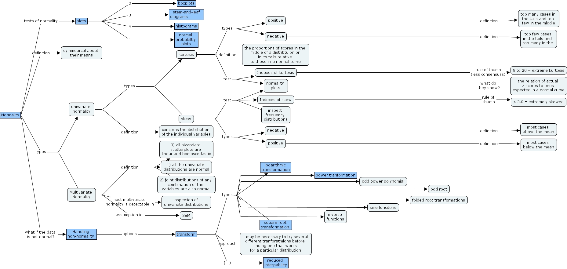 normality, transform, inspection of univariate distributions, histograms, plots, symmetircal about their means, inverse functions, power tranformation, positive, most cases above the mean, most cases below the mean, negative, odd power polynomial, normality plots, handling non-normality , sine funcitons, positive, folded root transformations, concerns the distribution of the individual variables, indexes of skew, reduced interpability, univariate normality, odd root, stem-and-leaf diagrams , normality, 8 to 20 = extreme kurtosis, logarithmic transformation, kurtosis, normal probabiltiy plots, sem, square root transformation , 3.0 = extremely skewed, inspect frequency distributions, too many cases in the tails and too few in the middle, too few cases in the tails and too many in the , boxplots, indexes of kurtosis, 3) all bivaraiate scatterplots are linear and homoscedastic, the relation of actual z scores to ones expected in a normal curve, negative, multivariate normality, the proportions of scores in the middle of a distribtuion or in its tails relative to those in a normal curve, skew, it may be necessary to try several different tranforatmions before finding one that works for a particular distribution, 2) joint distributions of any combination of the variables are also normal, 1) all the univariate distributions are normal
