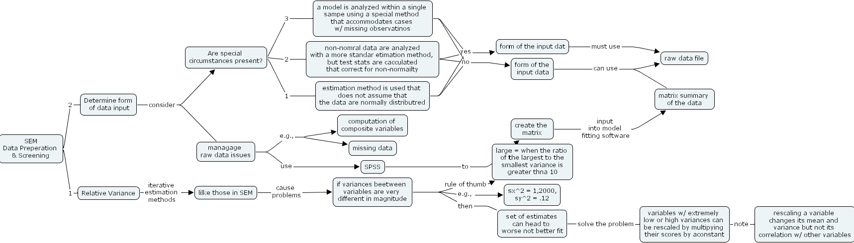 data preperation and screening, a model is analyzed within a single sampe using a special method that accommodates cases w missing observatinos, computation of composite variables, managage raw data issues, sx^2 = 1,2000, sy^2 = .12, spss, missing data, rescaling a variable changes its mean and variance but not its correlation w other variables, large = when the ratio of the largest to the smallest variance is greater thna 10, form of the input data, matrix summary of the data, create the matrix, estimation method is used that does not assume that the data are normally distributred, non-nomral data are analyzed with a more standar etimation method, but test stats are cacculated that correct for non-normailty, relative variance, are special circumstances present?, form of the input dat, set of estimates can head to worse not better fit, raw data file, lilke those in sem, sem data preperation & screening, variables w extremely low or high variances can be rescaled by multipying their scores by aconstant, if variances beetween variables are very different in magnitude, determine form of data input