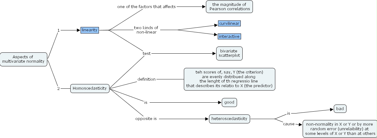 linearity and homoscedasticity, curvilinear, interactive, teh scores of, say, y (the criterion) are evenly distribued along the lenght of th regressio line that describes its relatio to x (the predictor), bad, homoscedasticity, the magnitude of pearson correlations, non-normality in x or y or by more random error (unrelaibility) at some levels of x or y than at others, bivariate scatterplot, heteroscedasticity, aspects of multivariate normality, linearity, good