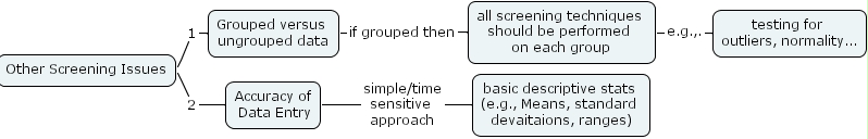 other screening issues, all screening techniques should be performed on each group, accuracy of data entry, basic descriptive stats (e.g., means, standard devaitaions, ranges), other screening issues, grouped versus ungrouped data, testing for outliers, normality...