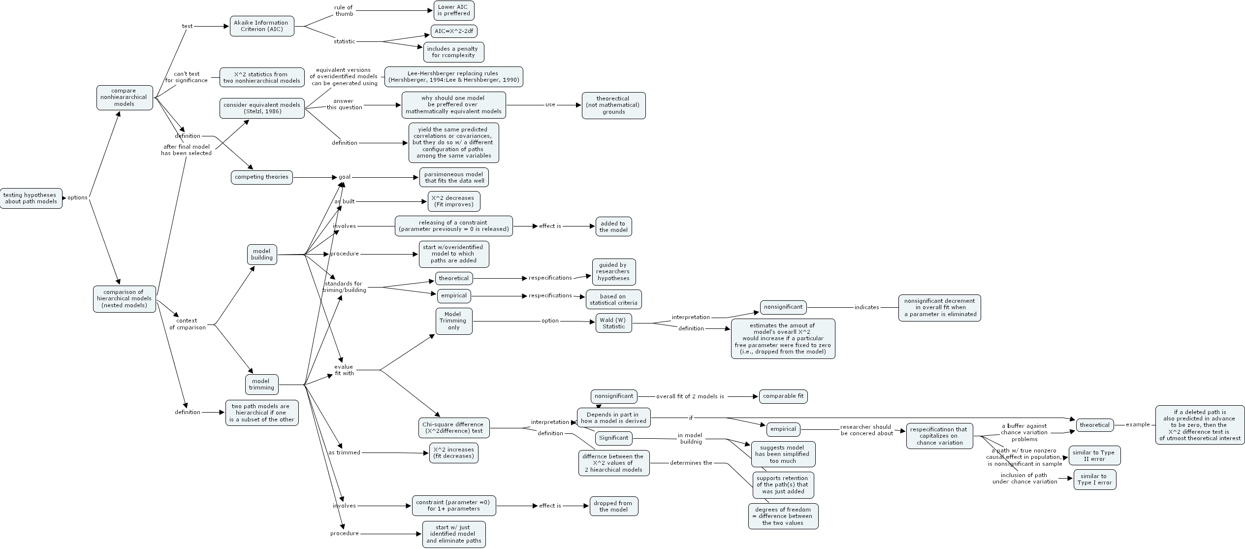 testing hypotheses about path models, model trimming, depends in part in how a model is derived, aic=x^2-2df, guided by researchers hypotheses, lower aic is preffered, differnce between the x^2 values of 2 hiearchical models, nonsignificant, theorectical (not mathematical) grounds, model trimming only, nonsignificant decrement in overall fit when a parameter is eliminated, model building, respecificatinon that capitalizes on chance variation, start w overidentified model to which paths are added, theoretical, testing hypotheses about path models, parsimoneous model that fits the data well, akaike information criterion (aic), empirical, degrees of freedom = difference between the two values, why should one model be preffered over mathematically equivalent models, x^2 increases (fit decreases), competing theories, consider equivalent models (stelzl, 1986), comparison of hierarchical models (nested models), comparable fit, dropped from the model, two path models are hierarchical if one is a subset of the other, significant, chi-square difference (x^2difference) test, constraint (parameter =0) for 1 parameters, suggests model has been simplified too much, estimates the amout of model's ovearll x^2 would increase if a particular free parameter were fixed to zero (i.e., dropped from the model), lee-hershberger replacing rules (hershberger, 1994 lee & hershberger, 1990), similar to type ii error, wald (w) statistic, supports retention of the path(s) that was just added, added to the model, empirical, nonsignificant, yield the same predicted correlations or covariances, but they do so w a different configuration of paths among the same variables, x^2 statistics from two nonhierarchical models, releasing of a constraint (parameter previously = 0 is released), theoretical, start w just identified model and eliminate paths, compare nonhieararchical models, similar to type i error, x^2 decreases (fit improves), if a deleted path is also predicted in advance to be zero, then the x^2 difference test is of utmost theoretical interest, based on statistical criteria, includes a penalty for rcomplexity