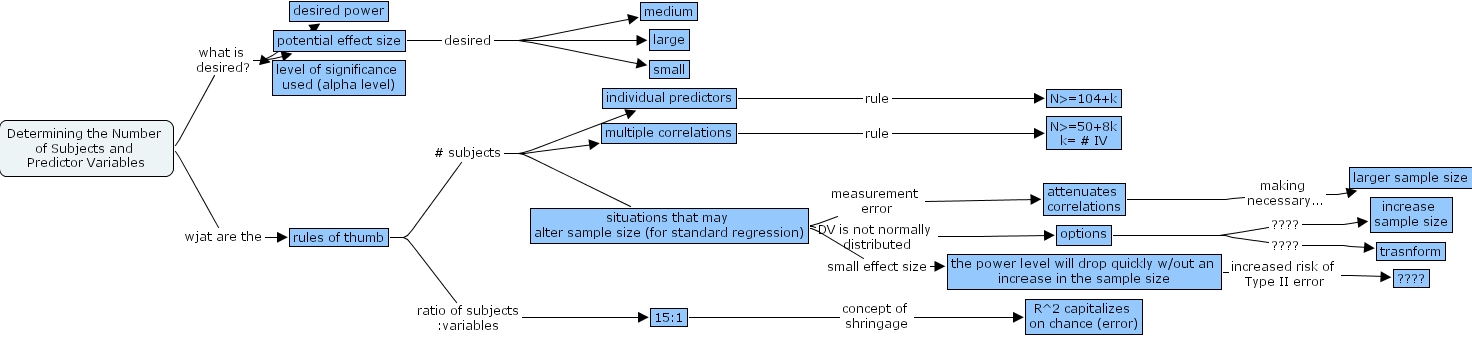 multiple regression - determing the number of subjects and predictor variables, trasnform, increase sample size, desired power, the power level will drop quickly w out an increase in the sample size, rules of thumb, individual predictors, 15 1, medium, n =104 k, level of significance used (alpha level), situations that may alter sample size (for standard regression), potential effect size, options, large, determining the number of subjects and predictor variables, multiple correlations, attenuates correlations, r^2 capitalizes on chance (error), larger sample size, n =50 8k k= iv, ????, small