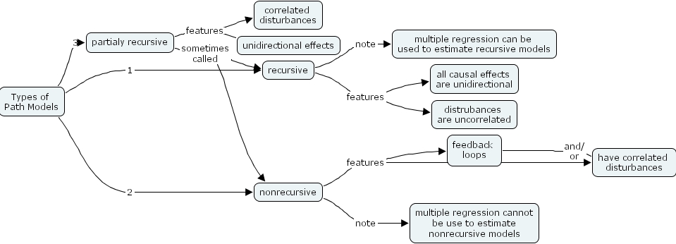 types of path models, feedback loops, types of path models, unidirectional effects, partialy recursive, multiple regression can be used to estimate recursive models, all causal effects are unidirectional, multiple regression cannot be use to estimate nonrecursive models, recursive, correlated disturbances, distrubances are uncorrelated, nonrecursive, have correlated disturbances