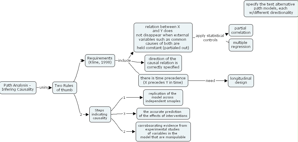 path analysis - infering causality, relation between x and y does not disappear when external variables such as common causes of both are held constant (partialed out), path analysis - infering causality, corroboarating evidence from experimental studies of variables in the model that are manipulable, there is time precedence (x precedes y in time), the accurate prediction of the effects of interventions, specify the test alternative path models, each w different directionality, two rules of thumb, replication of the model across independent smaples, requirements (kline, 1998), partial correlation, steps indicating causality, longitudinal design, direction of the causal relation is correctly specified, multiple regression