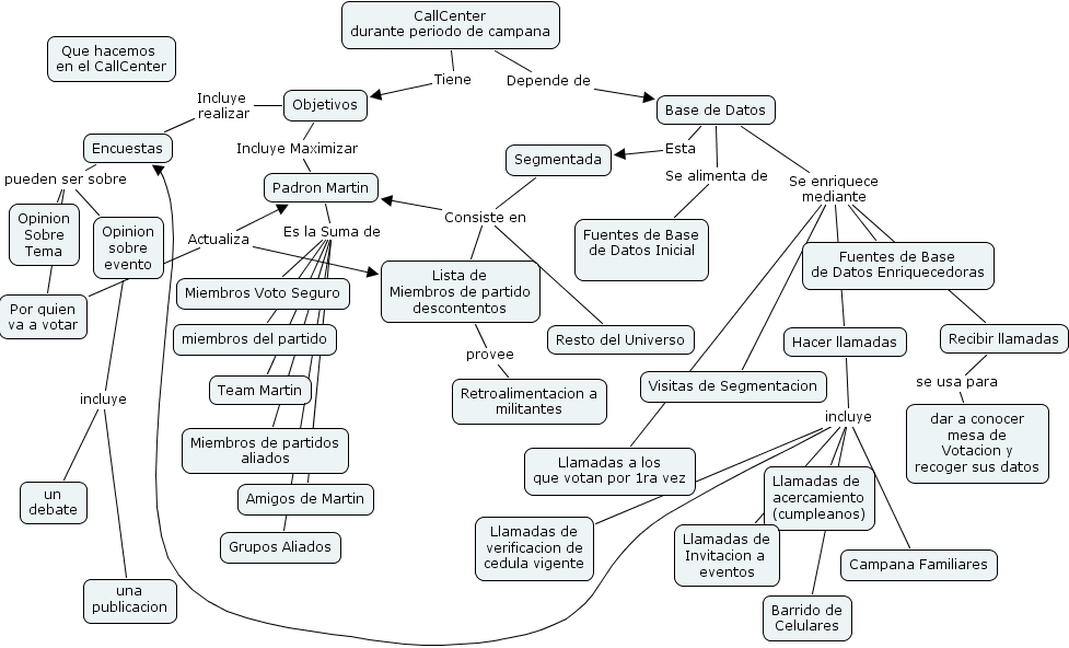 call center campana martin 2004, recibir llamadas, team martin, por quien va a votar, fuentes de base de datos enriquecedoras, grupos aliados, encuestas, amigos de martin, llamadas de verificacion de cedula vigente, un debate, visitas de segmentacion, callcenter durante periodo de campana, miembros de partidos aliados, fuentes de base de datos inicial , base de datos, objetivos, hacer llamadas, barrido de celulares, padron martin, opinion sobre evento, dar a conocer mesa de votacion y recoger sus datos, lista de miembros de partido descontentos, llamadas de acercamiento (cumpleanos), llamadas de invitacion a eventos, una publicacion, campana familiares, opinion sobre tema, que hacemos en el callcenter, miembros del partido, llamadas a los que votan por 1ra vez, resto del universo, retroalimentacion a militantes, segmentada, miembros voto seguro