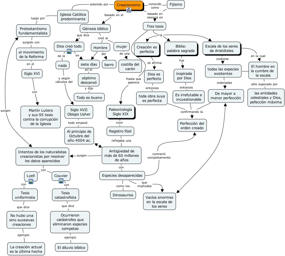 Escala de los seres de Arist�teles contiene todas las especies existentes, mujer de una costilla del var�n, todas las especies existentes ordenadas De mayor a menor perfecci�n, el movimiento de la Reforma en el Siglo XVI, Iglesia Cat�lica predominante luego por Protestantismo fundamentalista, Siglo XVII Obispo Usher todo empez� Al principio de Octubre del a�o 4004 ac., Antig�edad de m�s de 60 millones de a�os con Especies desaparecidas, Tres tesis la Biblia: palabra sagrada, Tres tesis la Escala de los seres de Arist�teles, Tres tesis la Creaci�n es perfecta, Creacionismo basado en el G�nesis b�blico, inspirada por Dios entonces Es irrefutable e incuestionable, Lyell con Tesis uniformista, Paleontolog�a Siglo XIX cuyo Registro f�sil, Especies desaparecidas que implicaba Vac�os enormes en la escala de los seres, Tesis catastrofista que dice Ocurrieron cat�strofes que eliminaron especies competas, El hombre en la cumbre de la escala s�lo superado por las entidades celestiales y Dios, pefecci�n m�xima, Couvier con Tesis catastrofista, Hombre del barro, Dios cre� todo en siete d�as, Creacionismo conocido como Fijismo, s�ptimo descans� y dijo Todo es bueno, G�nesis b�blico que dice Dios cre� todo, Creacionismo basado en esencia en Tres tesis, Registro f�sil reflejaba una Antig�edad de m�s de 60 millones de a�os, Fijismo basado en esencia en Tres tesis, Siglo XVI con Mart�n Lutero y sus 95 tesis contra la corrupci�n de la Iglesia, Al principio de Octubre del a�o 4004 ac. ???? Antig�edad de m�s de 60 millones de a�os, Es irrefutable e incuestionable confirmando la Perfecci�n del orden creado, G�nesis b�blico cre� al Hombre, G�nesis b�blico cre� al mujer, nada y seg�n c�lculos del Siglo XVII Obispo Usher, Especies desaparecidas contrari� completamente Perfecci�n del orden creado, Escala de los seres de Arist�teles en la cual El hombre en la cumbre de la escala, Tres tesis Hasta que aparece Paleontolog�a Siglo XIX, todas las especies existentes ???? El hombre en la cumbre de la escala, No hubo una sino sucesivas creaciones ejemplo La creaci�n actual es la �ltima hecha, siete d�as en el s�ptimo descans�, Vac�os enormes en la escala de los seres De mayor a menor perfecci�n, Hombre siete d�as, Creacionismo sotenido por Iglesia Cat�lica predominante, Tesis uniformista que dice No hubo una sino sucesivas creaciones, De mayor a menor perfecci�n confirmando la Perfecci�n del orden creado, Dios cre� todo de la nada, Dios es perfecto entonces toda obra suya es perfecta, toda obra suya es perfecta confirmando la Perfecci�n del orden creado, Protestantismo fundamentalista surgido con el movimiento de la Reforma, Especies desaparecidas como los Dinosaurios, Biblia: palabra sagrada fue inspirada por Dios, Ocurrieron cat�strofes que eliminaron especies competas ejemplo El diluvio b�blico, Creaci�n es perfecta se afirma Dios es perfecto, Intentos de los naturalistas creacionistas por resolver los datos aparecidos con Couvier, Intentos de los naturalistas creacionistas por resolver los datos aparecidos con Lyell