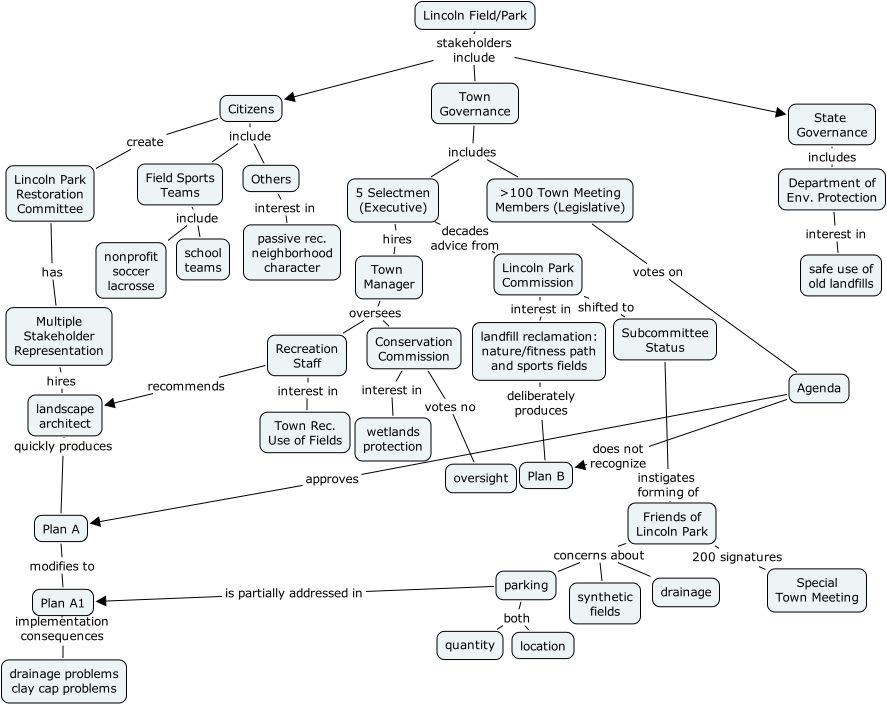 Field Sports Teams include school teams, Field Sports Teams include nonprofit soccer lacrosse, landscape architect quickly produces Plan A, Town Manager oversees Conservation Commission, Town Manager oversees Recreation Staff, landfill reclamation: nature/fitness path and sports fields deliberately produces Plan B, Citizens create Lincoln Park Restoration Committee, parking is partially addressed in Plan A1, State Governance includes Department of Env. Protection, parking both quantity, parking both location, Friends of Lincoln Park 200 signatures Special Town Meeting, 5 Selectmen (Executive) hires Town Manager, Department of Env. Protection interest in safe use of old landfills, >100 Town Meeting Members (Legislative) votes on Agenda, Plan A1 implementation consequences drainage problems clay cap problems, Lincoln Park Commission shifted to Subcommittee Status, Recreation Staff interest in Town Rec. Use of Fields, Agenda does not recognize Plan B, Friends of Lincoln Park concerns about drainage, Friends of Lincoln Park concerns about parking, Friends of Lincoln Park concerns about synthetic fields, Lincoln Park Restoration Committee has Multiple Stakeholder Representation, Conservation Commission interest in wetlands protection, Others interest in passive rec. neighborhood character, Lincoln Field/Park stakeholders include Citizens, Lincoln Field/Park stakeholders include Town Governance, Lincoln Field/Park stakeholders include State Governance, Multiple Stakeholder Representation hires landscape architect, Subcommittee Status instigates forming of Friends of Lincoln Park, 5 Selectmen (Executive) decades advice from Lincoln Park Commission, Agenda approves Plan A, Town Governance includes >100 Town Meeting Members (Legislative), Town Governance includes 5 Selectmen (Executive), Citizens include Field Sports Teams, Citizens include Others, Plan A modifies to Plan A1, Conservation Commission votes no oversight, Lincoln Park Commission interest in landfill reclamation: nature/fitness path and sports fields, Recreation Staff recommends landscape architect