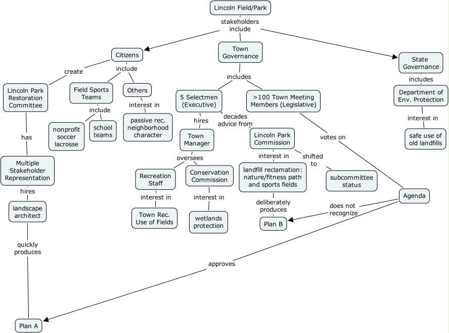 Department of Env. Protection interest in safe use of old landfills, Town Manager oversees Recreation Staff, Town Manager oversees Conservation Commission, Agenda does not recognize Plan B, 5 Selectmen (Executive) hires Town Manager, >100 Town Meeting Members (Legislative) votes on Agenda, landfill reclamation: nature/fitness path and sports fields deliberately produces Plan B, Lincoln Park Commission shifted to subcommittee status, Citizens include Others, Citizens include Field Sports Teams, Town Governance includes 5 Selectmen (Executive), Town Governance includes >100 Town Meeting Members (Legislative), Agenda approves Plan A, 5 Selectmen (Executive) decades advice from Lincoln Park Commission, Conservation Commission interest in wetlands protection, landscape architect quickly produces Plan A, Multiple Stakeholder Representation hires landscape architect, Lincoln Park Commission interest in landfill reclamation: nature/fitness path and sports fields, Field Sports Teams include nonprofit soccer lacrosse, Field Sports Teams include school teams, State Governance includes Department of Env. Protection, Recreation Staff interest in Town Rec. Use of Fields, Others interest in passive rec. neighborhood character, Citizens create Lincoln Park Restoration Committee, Lincoln Park Restoration Committee has Multiple Stakeholder Representation, Lincoln Field/Park stakeholders include Town Governance, Lincoln Field/Park stakeholders include Citizens, Lincoln Field/Park stakeholders include State Governance