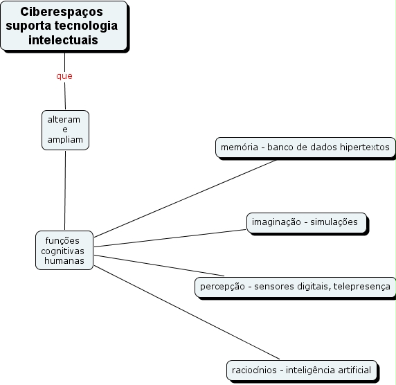 Ciberespa�os suporta tecnologia intelectuais que alteram e ampliam, alteram e ampliam fun��es cognitivas humanas mem�ria - banco de dados hipertextos, alteram e ampliam fun��es cognitivas humanas racioc�nios - intelig�ncia artificial, alteram e ampliam fun��es cognitivas humanas imagina��o - simula��es , alteram e ampliam fun��es cognitivas humanas percep��o - sensores digitais, telepresen�a