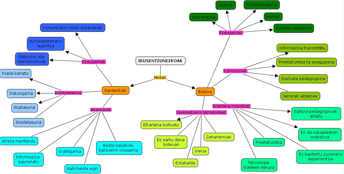 bideoa eta gardekiak (3), eztabaida, oso erabilia, aurkezpenerako laguntza, ez baztertu zuzeneko esperientzia, informazioa transmititu, estimulu pizgarria, sinpletasuna, ugariak, ikerketa pedagogikoa, informazioa eguneratu, argitasuna, jarrerak aldatzea, plangintzaduna, egitura pedagogikoak aldatu, teknologia ikasleen eskura, ez da irakaslearen ordezkoa, kopia banatu, bideoa, beste baliabide batzuekin osagarria , erabilgarria, nahi beste egin, irakurgarria, elkarlana bultzatu, ez sartu dena bideoan, komunikazio modu ezberdinak, prestakuntza, idatzizko eta marrazkizkoak, prestakuntza ta ezagupena, arreta mantendu, ikusentzunezkoak, zeharlerroak, irekiak, irekia, gardenkiak