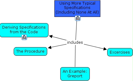 using more typical specifications (including none at all), an example greport, deriving specifications from the code, using more typical specifications (including none at all), the procedure, excercises