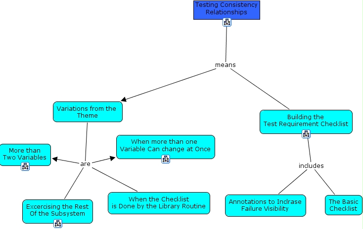 testing consistency relationships, when the checklist is done by the library routine, annotations to inclrase failure visibility, excercising the rest of the subsystem, variations from the theme, building the test requirement checklist, testing consistency relationships, the basic checklist, more than two variables, when more than one variable can change at once