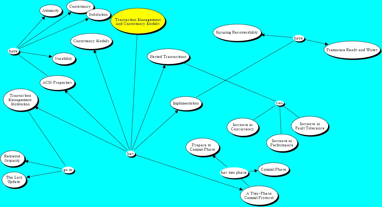 ACID Properties have Consistency, ACID Properties have Isololation, ACID Properties have Durability, ACID Properties have Atomicity, Transaction Management and Consistency Models has Nested Transactions, Transaction Management and Consistency Models has Consistency Models, Transaction Management and Consistency Models has Transaction Management Motivation, Transaction Management and Consistency Models has ACID Properties, Transaction Management and Consistency Models has Implimentation, Transaction Management and Consistency Models has A Two-Phase Commit Protocol, A Two-Phase Commit Protocol has two phase Prepare to Commit Phase, A Two-Phase Commit Protocol has two phase Commit Phase, Nested Transactions can Increase in Concurrency, Nested Transactions can Increase in Performance, Nested Transactions can Increase in Fault Tolerance, Transaction Management Motivation go to The Lost Update, Transaction Management Motivation go to Retrieval Disparity, Implimentation have Premature Reads and Writes, Implimentation have Ensuring Recoverability