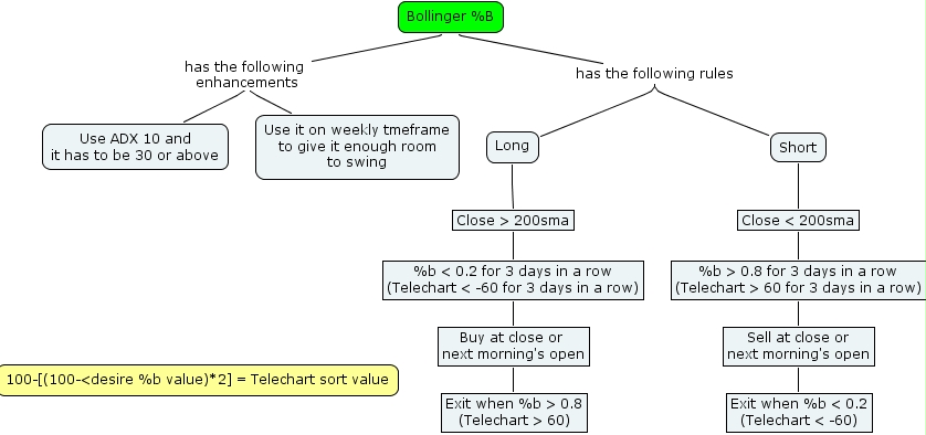 Bollinger %B has the following enhancements Use ADX 10 and it has to be 30 or above, Bollinger %B has the following enhancements Use it on weekly tmeframe to give it enough room to swing, %b > 0.8 for 3 days in a row (Telechart > 60 for 3 days in a row) Sell at close or next morning's open Exit when %b < 0.2 (Telechart < -60), Short Close < 200sma %b > 0.8 for 3 days in a row (Telechart > 60 for 3 days in a row), Close < 200sma %b > 0.8 for 3 days in a row (Telechart > 60 for 3 days in a row) Sell at close or next morning's open, Close > 200sma %b < 0.2 for 3 days in a row (Telechart < -60 for 3 days in a row) Buy at close or next morning's open, %b < 0.2 for 3 days in a row (Telechart < -60 for 3 days in a row) Buy at close or next morning's open Exit when %b > 0.8 (Telechart > 60), Long Close > 200sma %b < 0.2 for 3 days in a row (Telechart < -60 for 3 days in a row), Bollinger %B has the following rules Short, Bollinger %B has the following rules Long