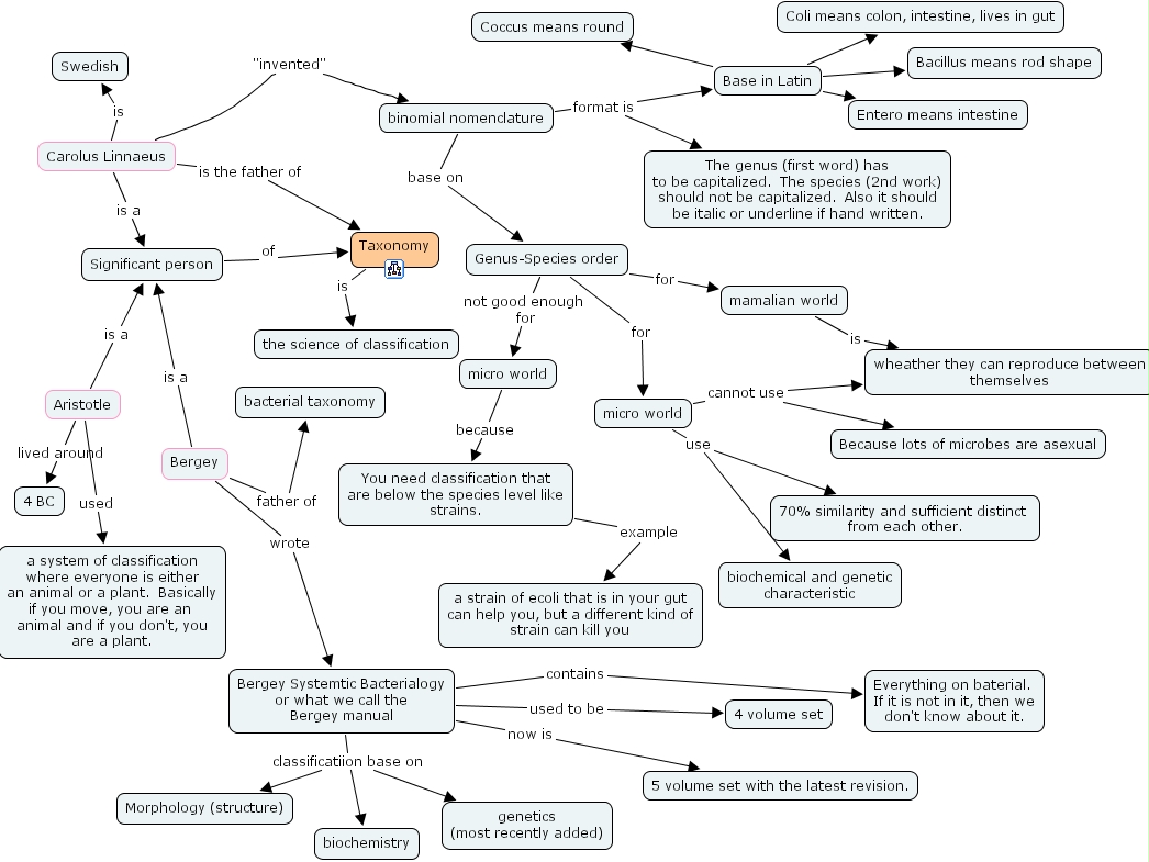 Carolus Linnaeus is the father of Taxonomy, Carolus Linnaeus is Swedish, binomial nomenclature format is Base in Latin, binomial nomenclature format is The genus (first word) has to be capitalized. The species (2nd work) should not be capitalized. Also it should be italic or underline if hand written., Bergey Systemtic Bacterialogy or what we call the Bergey manual used to be 4 volume set, Bergey is a Significant person, Bergey wrote Bergey Systemtic Bacterialogy or what we call the Bergey manual, micro world because You need classification that are below the species level like strains., micro world cannot use Because lots of microbes are asexual, micro world cannot use wheather they can reproduce between themselves, Carolus Linnaeus "invented" binomial nomenclature, You need classification that are below the species level like strains. example a strain of ecoli that is in your gut can help you, but a different kind of strain can kill you, Aristotle used a system of classification where everyone is either an animal or a plant. Basically if you move, you are an animal and if you don't, you are a plant., Aristotle lived around 4 BC, Genus-Species order for micro world, Aristotle is a Significant person, Bergey Systemtic Bacterialogy or what we call the Bergey manual classificatiion base on biochemistry, Bergey Systemtic Bacterialogy or what we call the Bergey manual classificatiion base on genetics (most recently added), Bergey Systemtic Bacterialogy or what we call the Bergey manual classificatiion base on Morphology (structure), Genus-Species order for mamalian world, Significant person of Taxonomy, Taxonomy is the science of classification, Carolus Linnaeus is a Significant person, Bergey Systemtic Bacterialogy or what we call the Bergey manual contains Everything on baterial. If it is not in it, then we don't know about it., Bergey father of bacterial taxonomy, micro world use biochemical and genetic characteristic, micro world use 70% similarity and sufficient distinct from each other., mamalian world is wheather they can reproduce between themselves, binomial nomenclature base on Genus-Species order, Genus-Species order not good enough for micro world, Bergey Systemtic Bacterialogy or what we call the Bergey manual now is 5 volume set with the latest revision.