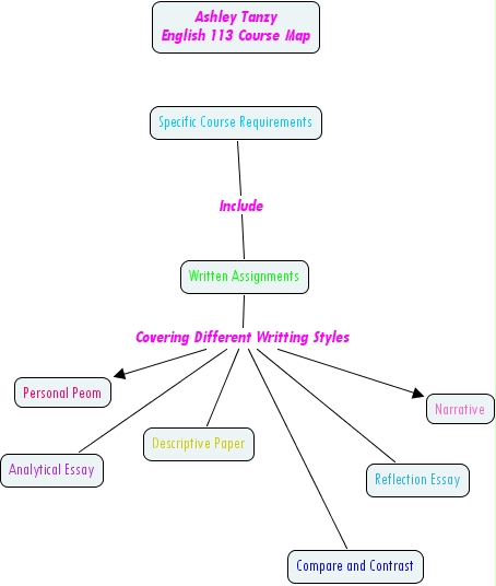 ashley tanzy eng113 corsemap, specific course requirements, descriptive paper, narrative, compare and contrast, personal peom, reflection essay, written assignments, ashley tanzy english 113 course map, analytical essay