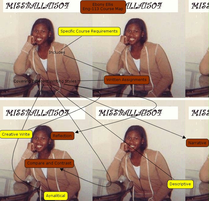 ebony ellis-cmap1, creative write, narrative, descriptive, aynalitical, ebony ellis eng-113 course map, specific course requirements, compare and contrast, reflection, written assignments