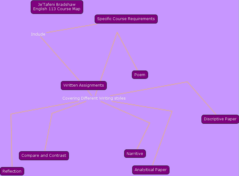 bradshaw eng 113 course map, narritive, specific course requirements, compare and contrast, je'tafeni bradshaw english 113 course map, poem, written assignments, discriptive paper, analyitical paper, reflection