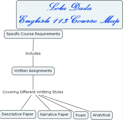 course map 1, analytical, specific course requirements, narrative paper, written assignments, poem, descriptive paper, lola dada english 113 course map