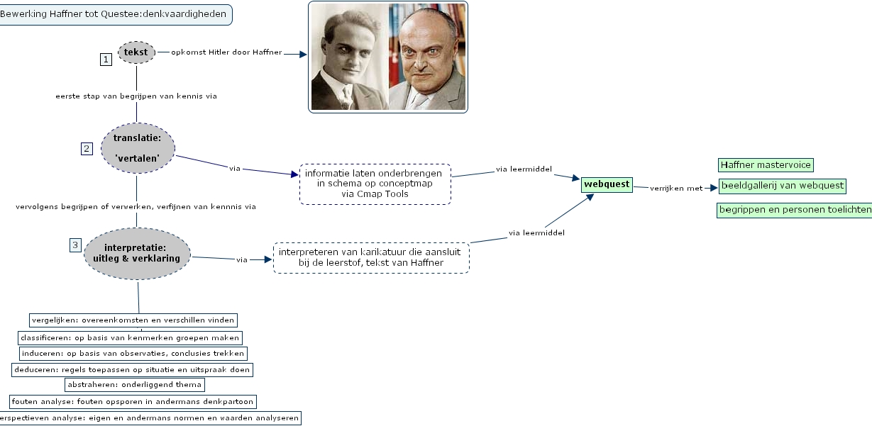 translatie: 'vertalen' vervolgens begrijpen of verwerken, verfijnen van kennnis via interpretatie: uitleg & verklaring, interpreteren van karikatuur die aansluit bij de leerstof, tekst van Haffner via leermiddel webquest, interpretatie: uitleg & verklaring via interpreteren van karikatuur die aansluit bij de leerstof, tekst van Haffner, translatie: 'vertalen' via informatie laten onderbrengen in schema op conceptmap via Cmap Tools, informatie laten onderbrengen in schema op conceptmap via Cmap Tools via leermiddel webquest, tekst opkomst Hitler door Haffner , tekst eerste stap van begrijpen van kennis via translatie: 'vertalen', webquest verrijken met beeldgallerij van webquest, interpretatie: uitleg & verklaring nl vergelijken: overeenkomsten en verschillen vinden