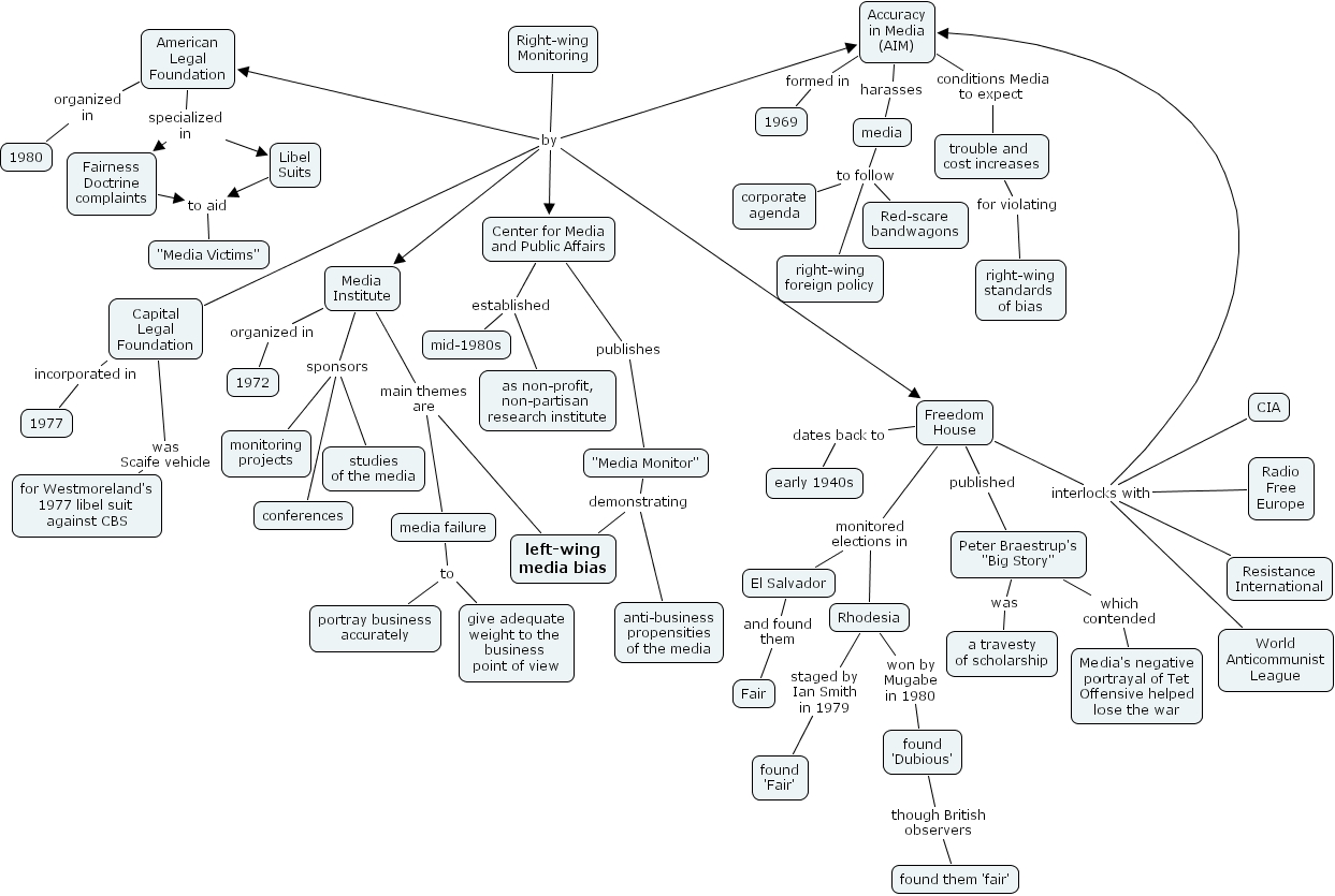 "Media Monitor" demonstrating anti-business propensities of the media, "Media Monitor" demonstrating left-wing media bias, Freedom House published Peter Braestrup's "Big Story", Center for Media and Public Affairs established as non-profit, non-partisan research institute, Center for Media and Public Affairs established mid-1980s, trouble and cost increases for violating right-wing standards of bias, Freedom House interlocks with CIA, Freedom House interlocks with World Anticommunist League, Freedom House interlocks with Accuracy in Media (AIM), Freedom House interlocks with Radio Free Europe, Freedom House interlocks with Resistance International, American Legal Foundation specialized in Libel Suits, American Legal Foundation specialized in Fairness Doctrine complaints, Capital Legal Foundation incorporated in 1977, Accuracy in Media (AIM) conditions Media to expect trouble and cost increases, found 'Dubious' though British observers found them 'fair', Freedom House dates back to early 1940s, Accuracy in Media (AIM) harasses media, Accuracy in Media (AIM) formed in 1969, Media Institute sponsors conferences, Media Institute sponsors studies of the media, Media Institute sponsors monitoring projects, Libel Suits to aid "Media Victims", media to follow corporate agenda, media to follow right-wing foreign policy, media to follow Red-scare bandwagons, Media Institute main themes are media failure, Media Institute main themes are left-wing media bias, American Legal Foundation organized in 1980, Capital Legal Foundation was Scaife vehicle for Westmoreland's 1977 libel suit against CBS, Center for Media and Public Affairs publishes "Media Monitor", Right-wing Monitoring by Freedom House, Right-wing Monitoring by Center for Media and Public Affairs, Right-wing Monitoring by Media Institute, Right-wing Monitoring by Capital Legal Foundation, Right-wing Monitoring by American Legal Foundation, Right-wing Monitoring by Accuracy in Media (AIM), Freedom House monitored elections in Rhodesia, Freedom House monitored elections in El Salvador, Fairness Doctrine complaints to aid "Media Victims", Media Institute organized in 1972, Rhodesia staged by Ian Smith in 1979 found 'Fair', Peter Braestrup's "Big Story" which contended Media's negative portrayal of Tet Offensive helped lose the war, Peter Braestrup's "Big Story" was a travesty of scholarship, El Salvador and found them Fair, Rhodesia won by Mugabe in 1980 found 'Dubious', media failure to portray business accurately, media failure to give adequate weight to the business point of view