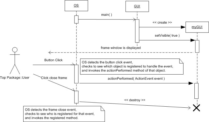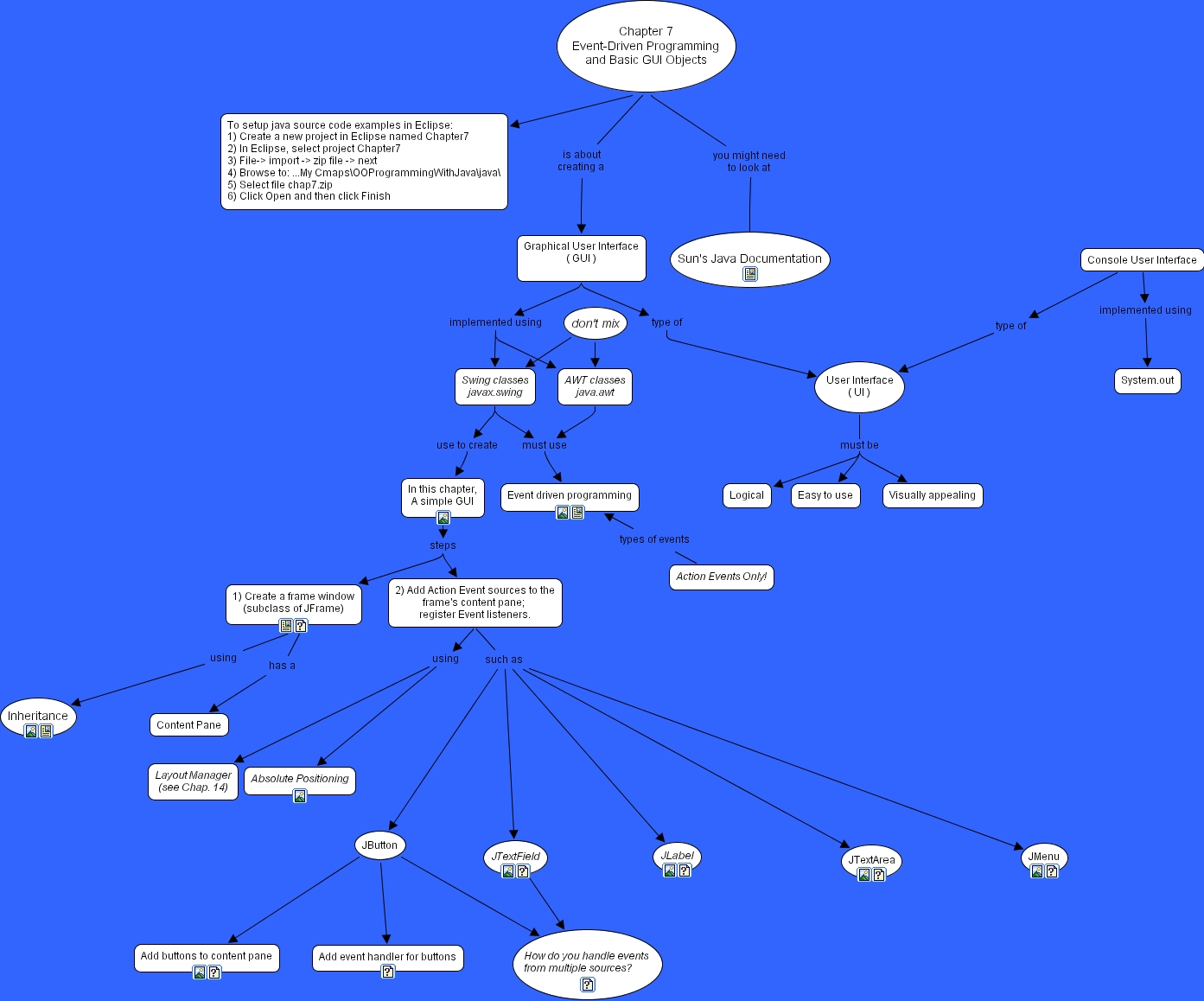 Console User Interface implemented using System.out, Swing classes javax.swing must use Event driven programming, Swing classes javax.swing use to create In this chapter, A simple GUI, In this chapter, A simple GUI steps 2) Add Action Event sources to the frame's content pane; register Event listeners., In this chapter, A simple GUI steps 1) Create a frame window (subclass of JFrame), Graphical User Interface ( GUI ) type of User Interface ( UI ), Console User Interface type of User Interface ( UI ), Graphical User Interface ( GUI ) implemented using Swing classes javax.swing, Graphical User Interface ( GUI ) implemented using AWT classes java.awt, don't mix AWT classes java.awt must use, 2) Add Action Event sources to the frame's content pane; register Event listeners. using Absolute Positioning, 2) Add Action Event sources to the frame's content pane; register Event listeners. using Layout Manager (see Chap. 14), 1) Create a frame window (subclass of JFrame) has a Content Pane, AWT classes java.awt must use Event driven programming, 2) Add Action Event sources to the frame's content pane; register Event listeners. such as JButton, 2) Add Action Event sources to the frame's content pane; register Event listeners. such as JLabel, 2) Add Action Event sources to the frame's content pane; register Event listeners. such as JTextArea, 2) Add Action Event sources to the frame's content pane; register Event listeners. such as JMenu, 2) Add Action Event sources to the frame's content pane; register Event listeners. such as JTextField, Chapter 7 Event-Driven Programming and Basic GUI Objects is about creating a Graphical User Interface ( GUI ) , 1) Create a frame window (subclass of JFrame) using Inheritance, Chapter 7 Event-Driven Programming and Basic GUI Objects you might need to look at Sun's Java Documentation, User Interface ( UI ) must be Logical, User Interface ( UI ) must be Easy to use, User Interface ( UI ) must be Visually appealing, don't mix Swing classes javax.swing must use, don't mix Swing classes javax.swing use to create