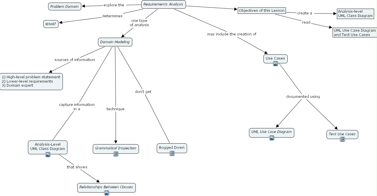 Analysis-Level UML Class Diagram that shows Relationships Between Classes, Requirements Analysis one type of analysis Domain Modeling, Domain Modeling technique Grammatical Inspection, Objectives of this Lesson create a Analysis-level UML Class Diagram, Domain Modeling sources of information 1) High-level problem statement 2) Lower-level requirements 3) Domain expert, Requirements Analysis Objectives of this Lesson create a , Requirements Analysis Objectives of this Lesson read, Objectives of this Lesson read UML Use Case Diagram and Text Use Cases, Requirements Analysis determines WHAT, Domain Modeling capture information in a Analysis-Level UML Class Diagram, Requirements Analysis may include the creation of Use Cases, Requirements Analysis explore the Problem Domain, Use Cases documented using UML Use Case Diagram, Use Cases documented using Text Use Cases, Domain Modeling don't get Bogged Down