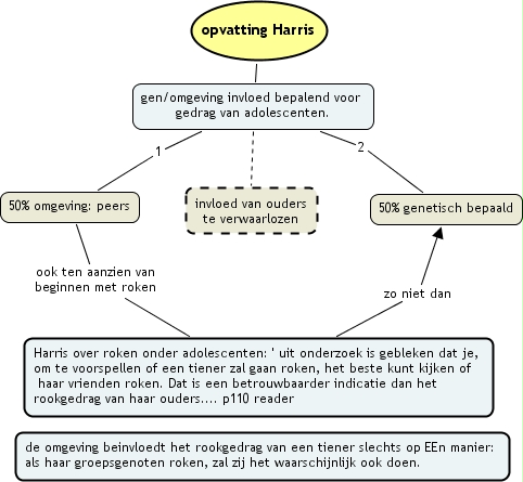 50% omgeving: peers ook ten aanzien van beginnen met roken Harris over roken onder adolescenten: ' uit onderzoek is gebleken dat je, om te voorspellen of een tiener zal gaan roken, het beste kunt kijken of haar vrienden roken. Dat is een betrouwbaarder indicatie dan het rookgedrag van haar ouders.... p110 reader, opvatting Harris gen/omgeving invloed bepalend voor gedrag van adolescenten. invloed van ouders te verwaarlozen, opvatting Harris gen/omgeving invloed bepalend voor gedrag van adolescenten. 1, opvatting Harris gen/omgeving invloed bepalend voor gedrag van adolescenten. 2, gen/omgeving invloed bepalend voor gedrag van adolescenten. 1 50% omgeving: peers, Harris over roken onder adolescenten: ' uit onderzoek is gebleken dat je, om te voorspellen of een tiener zal gaan roken, het beste kunt kijken of haar vrienden roken. Dat is een betrouwbaarder indicatie dan het rookgedrag van haar ouders.... p110 reader zo niet dan 50% genetisch bepaald, gen/omgeving invloed bepalend voor gedrag van adolescenten. 2 50% genetisch bepaald