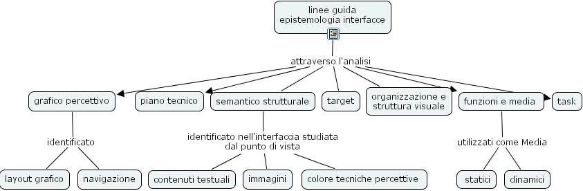 semantico strutturale identificato nell'interfaccia studiata dal punto di vista colore tecniche percettive , semantico strutturale identificato nell'interfaccia studiata dal punto di vista contenuti testuali, semantico strutturale identificato nell'interfaccia studiata dal punto di vista immagini, linee guida epistemologia interfacce attraverso l'analisi piano tecnico, linee guida epistemologia interfacce attraverso l'analisi funzioni e media , linee guida epistemologia interfacce attraverso l'analisi organizzazione e struttura visuale, linee guida epistemologia interfacce attraverso l'analisi target, linee guida epistemologia interfacce attraverso l'analisi semantico strutturale, linee guida epistemologia interfacce attraverso l'analisi grafico percettivo, linee guida epistemologia interfacce attraverso l'analisi task, grafico percettivo identificato layout grafico, grafico percettivo identificato navigazione, funzioni e media utilizzati come Media statici, funzioni e media utilizzati come Media dinamici