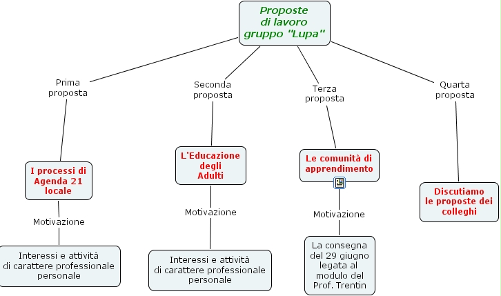 Proposte di lavoro gruppo "Lupa" Terza proposta Le comunit� di apprendimento, Proposte di lavoro gruppo "Lupa" Seconda proposta L'Educazione degli Adulti, I processi di Agenda 21 locale Motivazione Interessi e attivit� di carattere professionale personale, L'Educazione degli Adulti Motivazione Interessi e attivit� di carattere professionale personale, Proposte di lavoro gruppo "Lupa" Prima proposta I processi di Agenda 21 locale, Le comunit� di apprendimento Motivazione La consegna del 29 giugno legata al modulo del Prof. Trentin, Proposte di lavoro gruppo "Lupa" Quarta proposta Discutiamo le proposte dei colleghi
