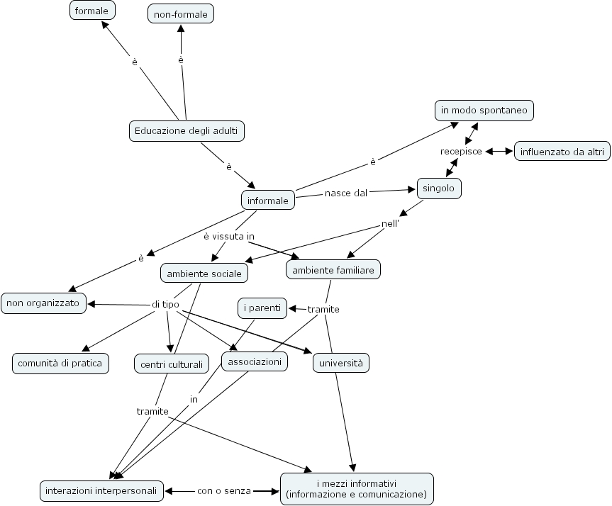 ambiente sociale tramite interazioni interpersonali, ambiente sociale tramite i mezzi informativi (informazione e comunicazione), informale nasce dal singolo, Educazione degli adulti � formale, singolo nell' ambiente familiare, singolo nell' ambiente sociale, informale � in modo spontaneo, singolo recepisce influenzato da altri, singolo recepisce in modo spontaneo, i mezzi informativi (informazione e comunicazione) con o senza interazioni interpersonali, i mezzi informativi (informazione e comunicazione) con o senza ????, informale � vissuta in ambiente familiare, informale � vissuta in ambiente familiare, informale � vissuta in ambiente sociale, Educazione degli adulti � non-formale, i parenti in interazioni interpersonali, informale � non organizzato, ambiente familiare tramite i parenti, ambiente familiare tramite i mezzi informativi (informazione e comunicazione), ambiente familiare tramite interazioni interpersonali, ambiente sociale di tipo non organizzato, ambiente sociale di tipo associazioni, ambiente sociale di tipo centri culturali, ambiente sociale di tipo comunit� di pratica, ambiente sociale di tipo universit�, ambiente sociale di tipo universit�, Educazione degli adulti � informale