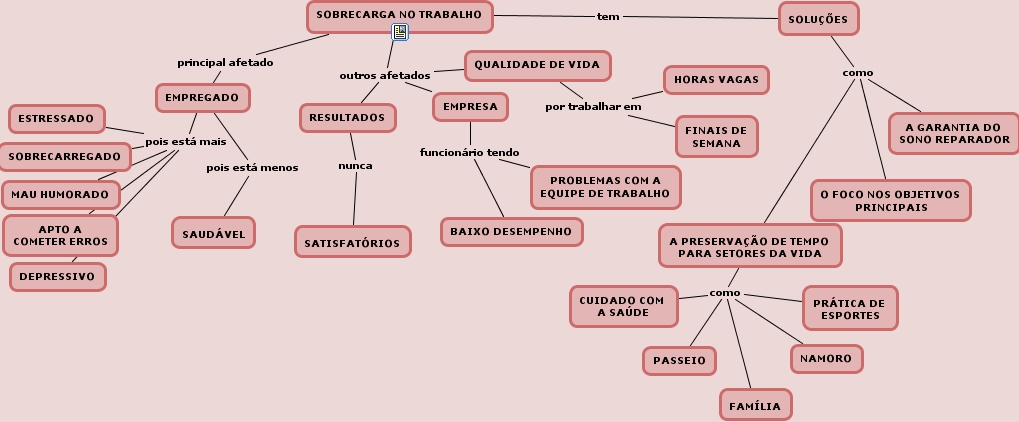 EMPRESA funcion�rio tendo PROBLEMAS COM A EQUIPE DE TRABALHO, EMPRESA funcion�rio tendo BAIXO DESEMPENHO, A PRESERVA��O DE TEMPO PARA SETORES DA VIDA como CUIDADO COM A SA�DE, A PRESERVA��O DE TEMPO PARA SETORES DA VIDA como NAMORO, A PRESERVA��O DE TEMPO PARA SETORES DA VIDA como FAM�LIA, A PRESERVA��O DE TEMPO PARA SETORES DA VIDA como PR�TICA DE ESPORTES, A PRESERVA��O DE TEMPO PARA SETORES DA VIDA como PASSEIO, SOBRECARGA NO TRABALHO outros afetados RESULTADOS, SOBRECARGA NO TRABALHO outros afetados EMPRESA, SOBRECARGA NO TRABALHO outros afetados QUALIDADE DE VIDA, EMPREGADO pois est� mais SOBRECARREGADO, EMPREGADO pois est� mais MAU HUMORADO, EMPREGADO pois est� mais DEPRESSIVO, EMPREGADO pois est� mais APTO A COMETER ERROS, EMPREGADO pois est� mais ESTRESSADO, QUALIDADE DE VIDA por trabalhar em FINAIS DE SEMANA, QUALIDADE DE VIDA por trabalhar em HORAS VAGAS, SOLU��ES como A GARANTIA DO SONO REPARADOR, SOLU��ES como A PRESERVA��O DE TEMPO PARA SETORES DA VIDA, SOLU��ES como O FOCO NOS OBJETIVOS PRINCIPAIS, RESULTADOS nunca SATISFAT�RIOS, SOBRECARGA NO TRABALHO tem SOLU��ES, EMPREGADO pois est� menos SAUD�VEL, SOBRECARGA NO TRABALHO principal afetado EMPREGADO