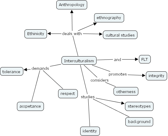Interculturalism promotes integrity, Interculturalism and FLT, Interculturalism deals with Ethinicity, Interculturalism deals with ethnography, Interculturalism deals with Anthropology, Interculturalism deals with cultural studies, Interculturalism demands respect, Interculturalism demands accpetance, Interculturalism demands tolerance, Interculturalism considers otherness, Interculturalism studies identity, Interculturalism studies stereotypes, Interculturalism studies background