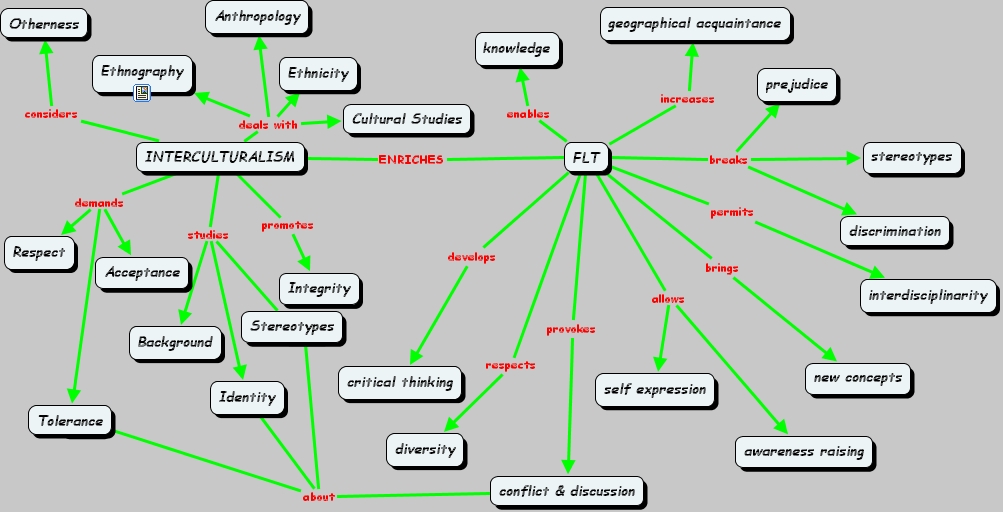 FLT brings new concepts, FLT increases geographical acquaintance, FLT allows self expression, FLT allows awareness raising, FLT develops critical thinking, FLT breaks prejudice, FLT breaks discrimination, FLT breaks stereotypes, INTERCULTURALISM deals with Ethnography, INTERCULTURALISM deals with Cultural Studies, INTERCULTURALISM deals with Ethnicity, INTERCULTURALISM deals with Anthropology, FLT permits interdisciplinarity, FLT enables knowledge, INTERCULTURALISM ENRICHES FLT, INTERCULTURALISM promotes Integrity, INTERCULTURALISM considers Otherness, INTERCULTURALISM demands Acceptance, INTERCULTURALISM demands Tolerance, INTERCULTURALISM demands Respect, conflict & discussion about ????, conflict & discussion about ????, conflict & discussion about Identity, INTERCULTURALISM studies Background, INTERCULTURALISM studies Identity, INTERCULTURALISM studies Stereotypes, FLT provokes conflict & discussion, FLT respects diversity
