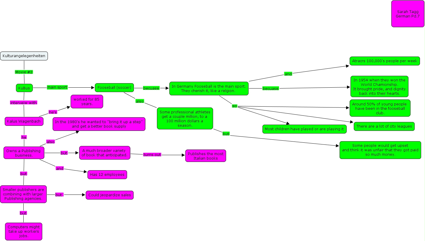 Culture C-map, Owns a Publishing business. and Has 12 employees, In Germany Fooseball is the main sport. They cherish it, like a relgion. and Atracrs 100,000's people per week, KuBus main sport Fooseball (soccer), Kalus Wagenbach he's worked for 85 years., In Germany Fooseball is the main sport. They cherish it, like a relgion. becuase In 1954 when they won the World Chamionship. It brought pride, and dignity back into their hearts., Owns a Publishing business. but Smaller publishers are combining with larger Publishing agencies., Some professional athletes get a couple million, to a 100 million dollars a season. but Some people would get upset and think it was unfair that they got paid so much money., Fooseball (soccer) becuase In Germany Fooseball is the main sport. They cherish it, like a relgion., Smaller publishers are combining with larger Publishing agencies. but Computers might take up workers jobs., Smaller publishers are combining with larger Publishing agencies. but Could jeopardize sales