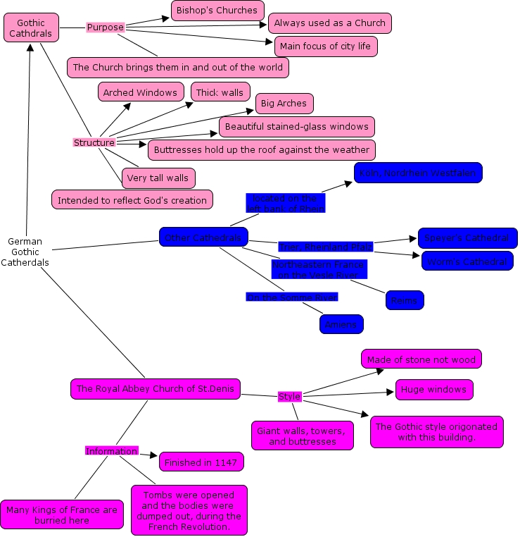 German Gothic Cathedrals, Gothic Cathdrals Structure Buttresses hold up the roof against the weather, The Royal Abbey Church of St.Denis Information Tombs were opened and the bodies were dumped out, during the French Revolution., Other Cathedrals German Gothic Catherdals Gothic Cathdrals, Gothic Cathdrals Structure Very tall walls, Other Cathedrals Trier, Rheinland Pfalz Speyer's Cathedral, Gothic Cathdrals Structure Intended to reflect God's creation, The Royal Abbey Church of St.Denis Style Made of stone not wood, Gothic Cathdrals Purpose Main focus of city life, Other Cathedrals German Gothic Catherdals Gothic Cathdrals, Other Cathedrals German Gothic Catherdals The Royal Abbey Church of St.Denis