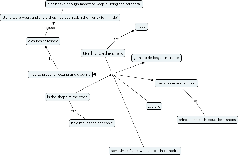 Cathedrals, a church collasped because stone were weak and the bishop had been takin the money for himslef, Gothic Cathedrals also had to prevent freezing and cracking, is the shape of the cross can hold thousands of people, Gothic Cathedrals also is the shape of the cross, Gothic Cathedrals also gothic style began in France, Gothic Cathedrals also has a pope and a priest, had to prevent freezing and cracking like a church collasped, has a pope and a priest like princes and such woudl be bishops, stone were weak and the bishop had been takin the money for himslef so didn't have enough money to keep building the cathedral, Gothic Cathedrals are huge