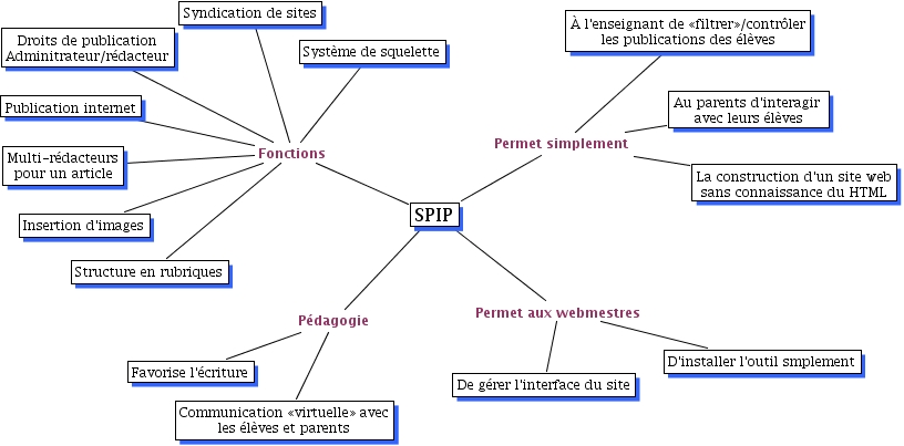 SPIP, SPIP Fonctions Multi-rédacteurs pour un article, SPIP Fonctions Publication internet, SPIP Pédagogie Favorise l'écriture, SPIP Permet aux webmestres De gérer l'interface du site, SPIP Fonctions Système de squelette, SPIP Permet simplement Au parents d'interagir avec leurs élèves, SPIP Fonctions Insertion d'images, SPIP Pédagogie Communication «virtuelle» avec les élèves et parents, SPIP Permet simplement La construction d'un site web sans connaissance du HTML, SPIP Permet aux webmestres D'installer l'outil smplement