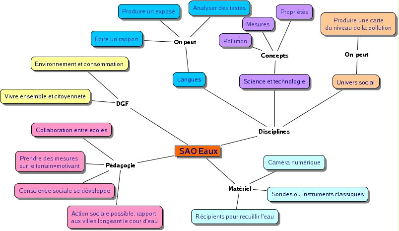 SAOEaux, Langues On peut Écire un rapport, SAO Eaux DGF Vivre ensemble et citoyenneté, SAO Eaux Pédagogie Action sociale possible: rapport aux villes longeant le cour d'eau, SAO Eaux Matériel Récipients pour recuillir l'eau, SAO Eaux DGF Environnement et consommation, SAO Eaux Disciplines Univers social, Langues On peut Analyser des textes, Langues On peut Produire un exposé, SAO Eaux Pédagogie Prendre des mesures sur le terrain=motivant, SAO Eaux Matériel Caméra numérique