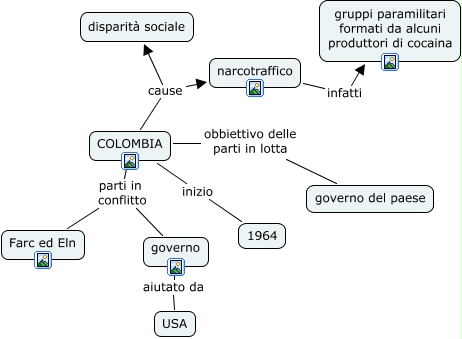 colombia fra, COLOMBIA inizio 1964, COLOMBIA parti in conflitto Farc ed Eln, governo aiutato da USA, COLOMBIA parti in conflitto governo, COLOMBIA cause disparità sociale, COLOMBIA cause narcotraffico, COLOMBIA obbiettivo delle parti in lotta governo del paese, narcotraffico infatti gruppi paramilitari formati da alcuni produttori di cocaina