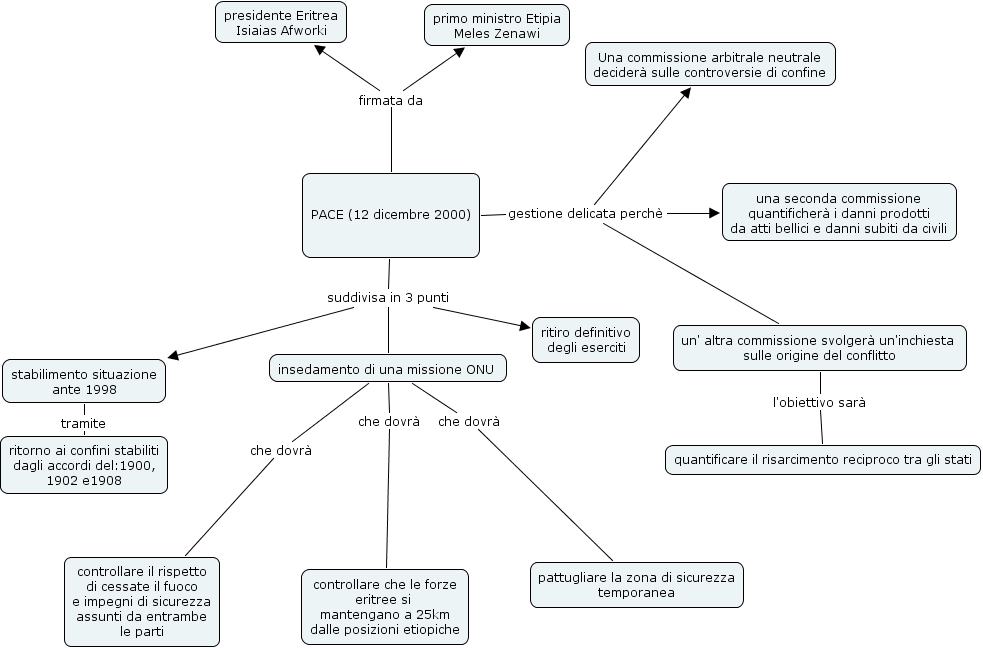 mappa pace, PACE (12 dicembre 2000) gestione delicata perchè una seconda commissione quantificherà i danni prodotti da atti bellici e danni subiti da civili, insedamento di una missione ONU che dovrà controllare il rispetto di cessate il fuoco e impegni di sicurezza assunti da entrambe le parti, insedamento di una missione ONU che dovrà controllare che le forze eritree si mantengano a 25km dalle posizioni etiopiche, PACE (12 dicembre 2000) gestione delicata perchè Una commissione arbitrale neutrale deciderà sulle controversie di confine, stabilimento situazione ante 1998 tramite ritorno ai confini stabiliti dagli accordi del:1900, 1902 e1908, PACE (12 dicembre 2000) firmata da presidente Eritrea Isiaias Afworki, PACE (12 dicembre 2000) suddivisa in 3 punti stabilimento situazione ante 1998, insedamento di una missione ONU che dovrà pattugliare la zona di sicurezza temporanea, un' altra commissione svolgerà un'inchiesta sulle origine del conflitto l'obiettivo sarà quantificare il risarcimento reciproco tra gli stati, PACE (12 dicembre 2000) firmata da primo ministro Etipia Meles Zenawi