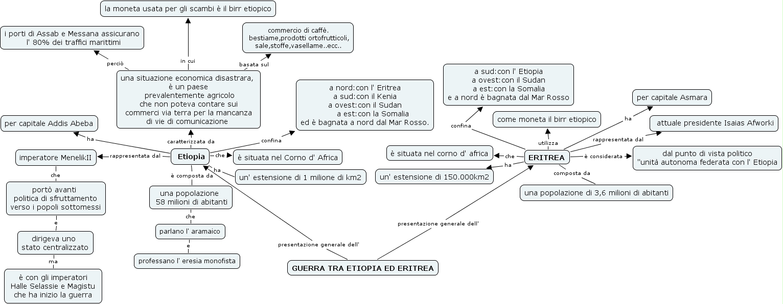 mappa Chiara presentazione stati, Etiopia che è situata nel Corno d' Africa, GUERRA TRA ETIOPIA ED ERITREA presentazione generale dell' Etiopia, ERITREA è considerata dal punto di vista politico "unità autonoma federata con l' Etiopia, Etiopia ha un' estensione di 1 milione di km2, portò avanti politica di sfruttamento verso i popoli sottomessi e dirigeva uno stato centralizzato, Etiopia rappresentata dal imperatore MenelikII, ERITREA ha un' estensione di 150.000km2, imperatore MenelikII che portò avanti politica di sfruttamento verso i popoli sottomessi, ERITREA ha per capitale Asmara, dirigeva uno stato centralizzato ma è con gli imperatori Halle Selassie e Magistu che ha inizio la guerra