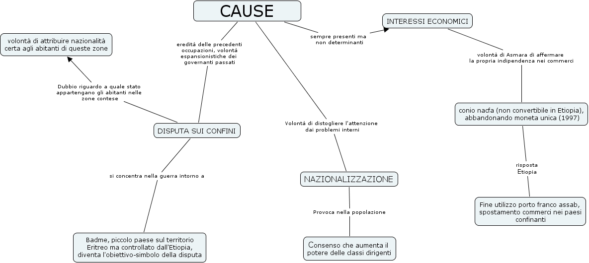 mappa cause, DISPUTA SUI CONFINI Dubbio riguardo a quale stato appartengano gli abitanti nelle zone contese volontà di attribuire nazionalità certa agli abitanti di queste zone, CAUSE volontà di distogliere l'attenzione dai problemi interni NAZIONALIZZAZIONE, NAZIONALIZZAZIONE Provoca nella popolazione Consenso che aumenta il potere delle classi dirigenti, DISPUTA SUI CONFINI si concentra nella guerra intorno a Badme, piccolo paese sul territorio Eritreo ma controllato dall'Etiopia, diventa l'obiettivo-simbolo della disputa, conio nacfa (non convertibile in Etiopia), abbandonando moneta unica (1997) risposta Etiopia Fine utilizzo porto franco assab, spostamento commerci nei paesi confinanti, CAUSE eredità delle precedenti occupazioni, volontà espansionistiche dei governanti passati DISPUTA SUI CONFINI, INTERESSI ECONOMICI volontà di Asmara di affermare la propria indipendenza nei commerci conio nacfa (non convertibile in Etiopia), abbandonando moneta unica (1997), CAUSE sempre presenti ma non determinanti INTERESSI ECONOMICI