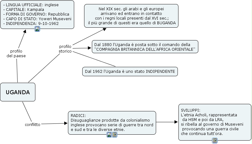 Conflitto Uganda Angelo, RADICI: Disuguaglianze prodotte da colonialismo inglese provocano serie di guerre tra nord e sud e tra le diverse etnie. ???? SVILUPPI: L'etnia Acholi, rappresentata da HSM e poi da LRA, si ribella al governo di Museveni provocando una guerra civile che continua tutt'ora., UGANDA conflitto RADICI: Disuguaglianze prodotte da colonialismo inglese provocano serie di guerre tra nord e sud e tra le diverse etnie., UGANDA profilo storico Dal 1880 l'Uganda è posta sotto il comando della "COMPAGNIA BRITANNICA DELL'AFRICA ORIENTALE", UGANDA profilo del paese - LINGUA UFFICIALE: inglese - CAPITALE: Kampala - FORMA DI GOVERNO: Repubblica - CAPO DI STATO: Yoweri Museveni - INDIPENDENZA: 9-10-1962, UGANDA profilo storico Nel XIX sec. gli arabi e gli europei arrivano ed entrano in contatto con i regni locali presenti dal XVI sec.; il più grande di questi era quello di BUGANDA, UGANDA profilo storico Dal 1962 l'Uganda è uno stato INDIPENDENTE