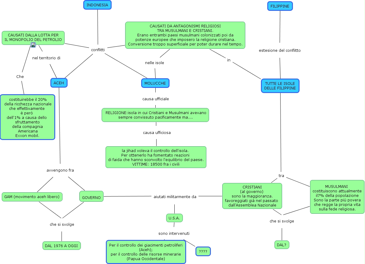 ADRI-JAMBO, RELIGIONE:isola in cui Cristiani e Musulmani avevano sempre convissuto pacificamente ma.... causa ufficiosa la jihad voleva il controllo dell'isola. Per ottenerlo ha fomentato reazioni di faida che hanno sconvolto l'equilibrio del paese. VITTIME: 18500 fra i civili, U.S.A. sono intervenuti ????, INDONESIA conflitti MOLUCCHE, FILIPPINE estesione del conflitto TUTTE LE ISOLE DELLE FILIPPINE, CAUSATI DALLA LOTTA PER IL MONOPOLIO DEL PETROLIO nel territorio di ACEH, CRISTIANI (al governo) sono la maggioranza. favoreggiati già nel passato dall'Assemblea Nazionale che si svolge DAL?, MUSULMANI costituiscono attualmente il7% della popolazione Sono la parte più povera che regge la propria vita sulla fede religiosa. che si svolge DAL?, CAUSATI DA ANTAGONISMI RELIGIOSI TRA MUSULMANI E CRISTIANI. Erano entrambi paesi musulmani colonizzati poi da potenze europee che imposero la religione cristiana. Conversione troppo superficiale per poter durare nel tempo. in TUTTE LE ISOLE DELLE FILIPPINE, TUTTE LE ISOLE DELLE FILIPPINE tra CRISTIANI (al governo) sono la maggioranza. favoreggiati già nel passato dall'Assemblea Nazionale, CRISTIANI (al governo) sono la maggioranza. favoreggiati già nel passato dall'Assemblea Nazionale aiutati militarmente da U.S.A.